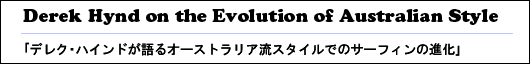 デレク・ハインドとガス・ディッカーソンのインタビューには多少の解説が必要である。ラッセル・ルイス、ブラッド・ワイブルーはシドニーのディーワイローカル。ハードな波で知られているディーワイのライトを岩の奥からメイクする数少ないサーファーであった。当時のヒーロー、ニーボーダーのジェフ・クロフォードはマイケル・ピーターソンを尋ねて1100キロ先のキラまで行き、マイケルはシドニーに来るとディーワイのジェフの家に滞在してサーフィンをしていた。そして共にドラッグに潰れ始めた。シェーン・ヘリングはMPにも似た消え方をしただけにその衝撃は大きい。その一方、現在でのプロサーファーはシェーン・ヘリングの悲劇を忘れてはならない、とデレクは語る。