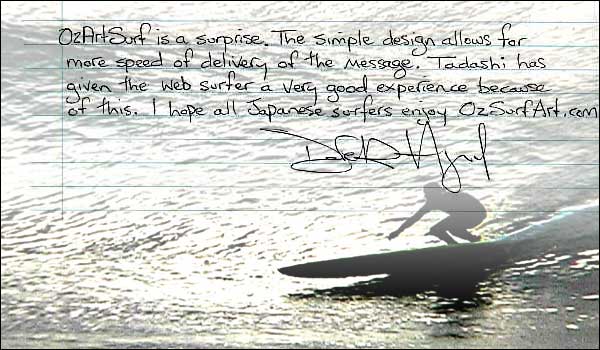 Photo : GLASS LOVEOZARTSURFには驚くべきものがある。 シンプルなデザインはメッセージをより速く伝える。タダシはウェブサーファーに素晴らしい経験を与えるであろう。その訳は数々のページを見れば解るであろう。 全ての日本のサーファーがOZARTSURFをエンジョイする事を期待する。 ー デレク・ハインド